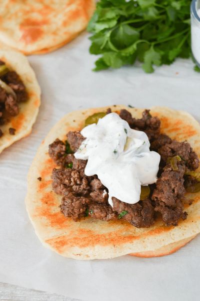 You may want to bake flatbread first so it has time to bake and cool while you prepare the ground beef and sauce.